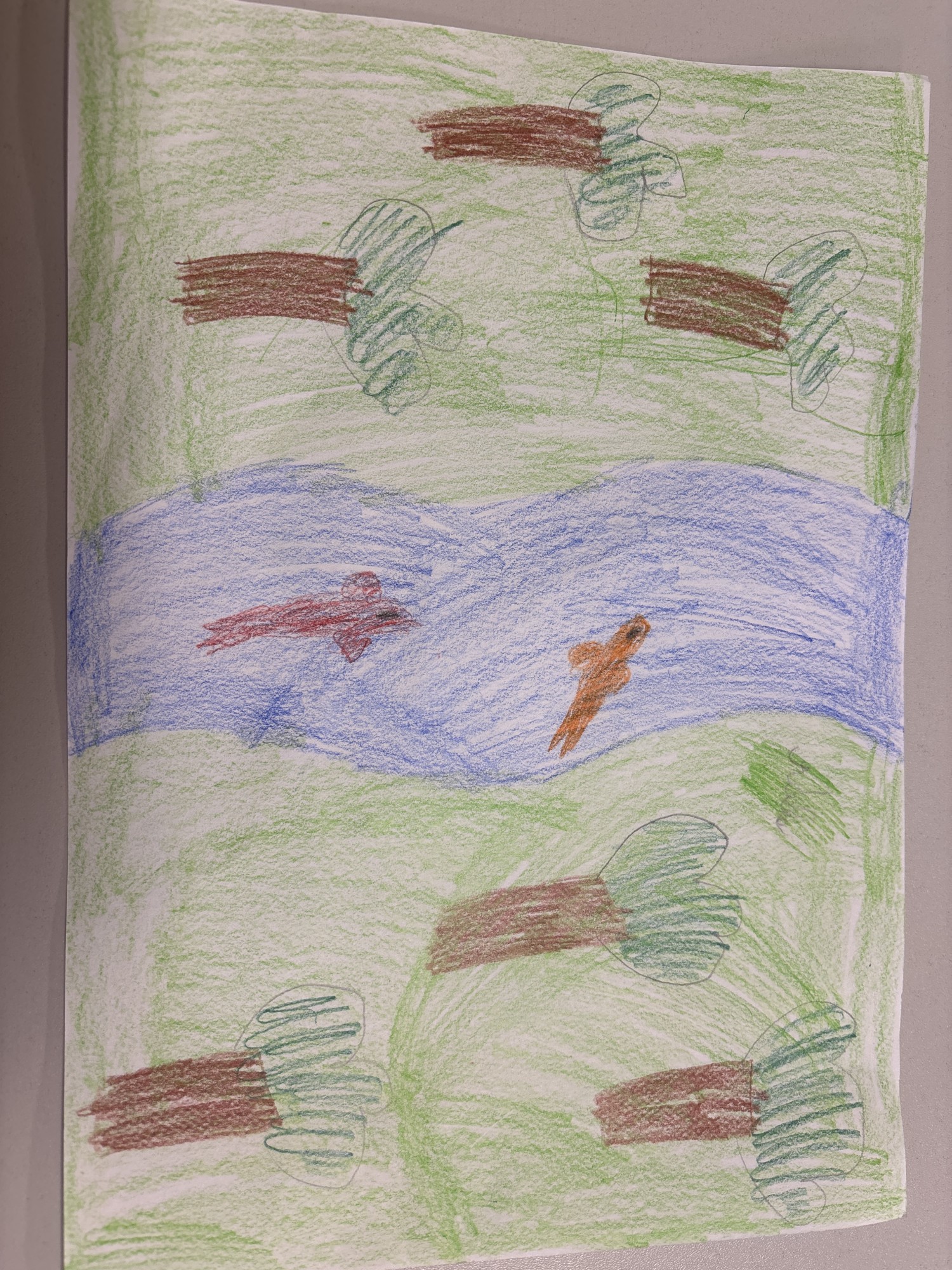 Pa upi peld divas zivis. Upe ir tieši mežā. Zivis meklē barību. Meža aug daudz koku.