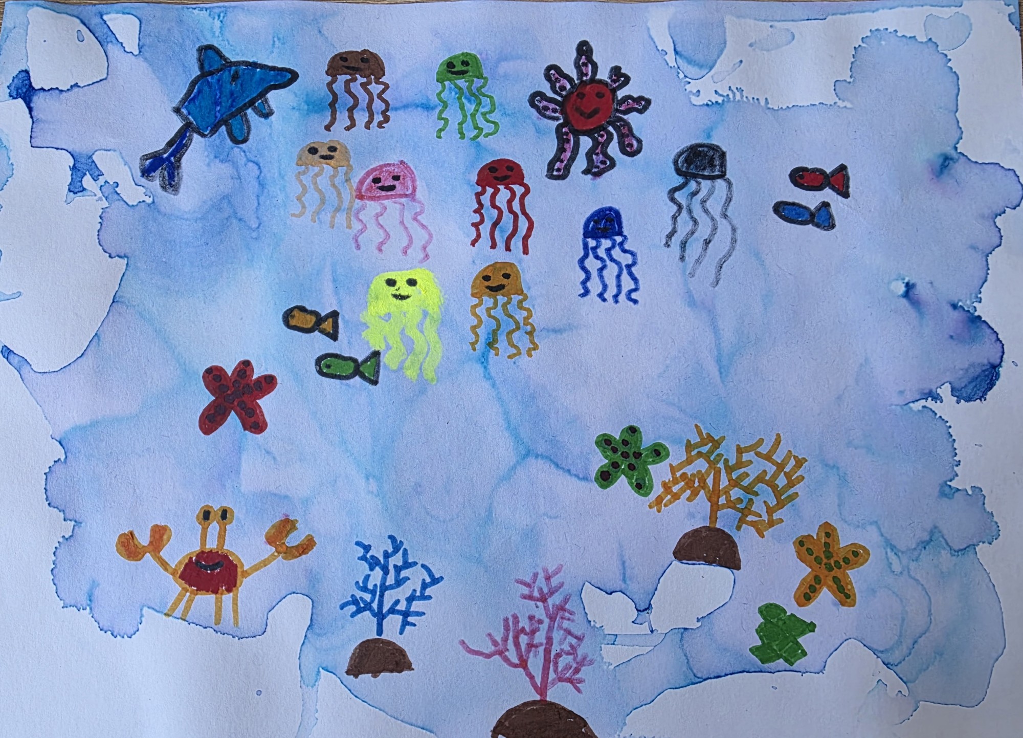 Zīmējumā ir delfīns, astoņkājis un daudz krāsainu medūzu. Viņi visi peld uz lielo ballīti pie krabja. Krabis ir ļoti priecīgs un māj ar abām spīlēm.