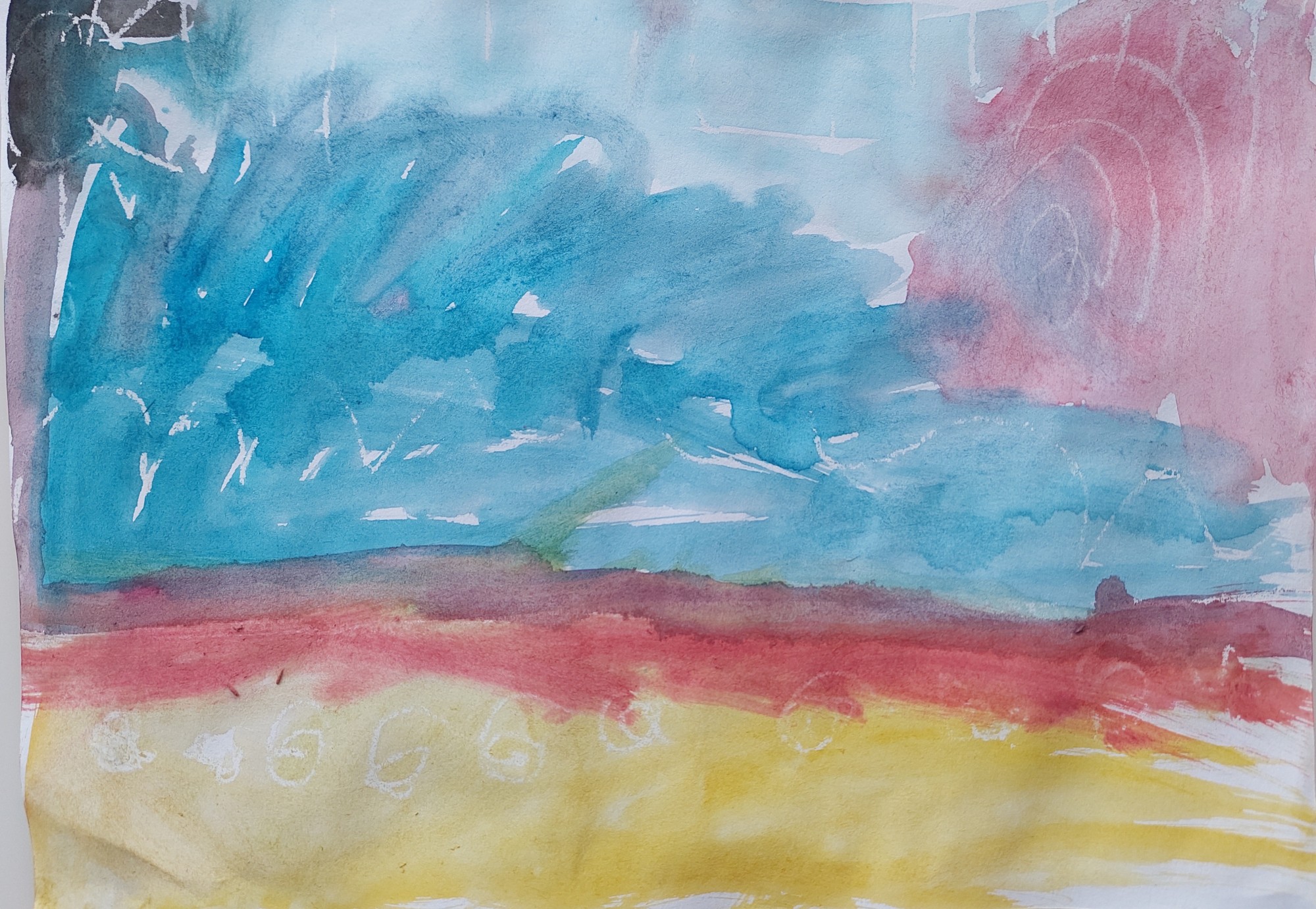 A4 formāts, balts krītiņš, akvareļu krāsas.