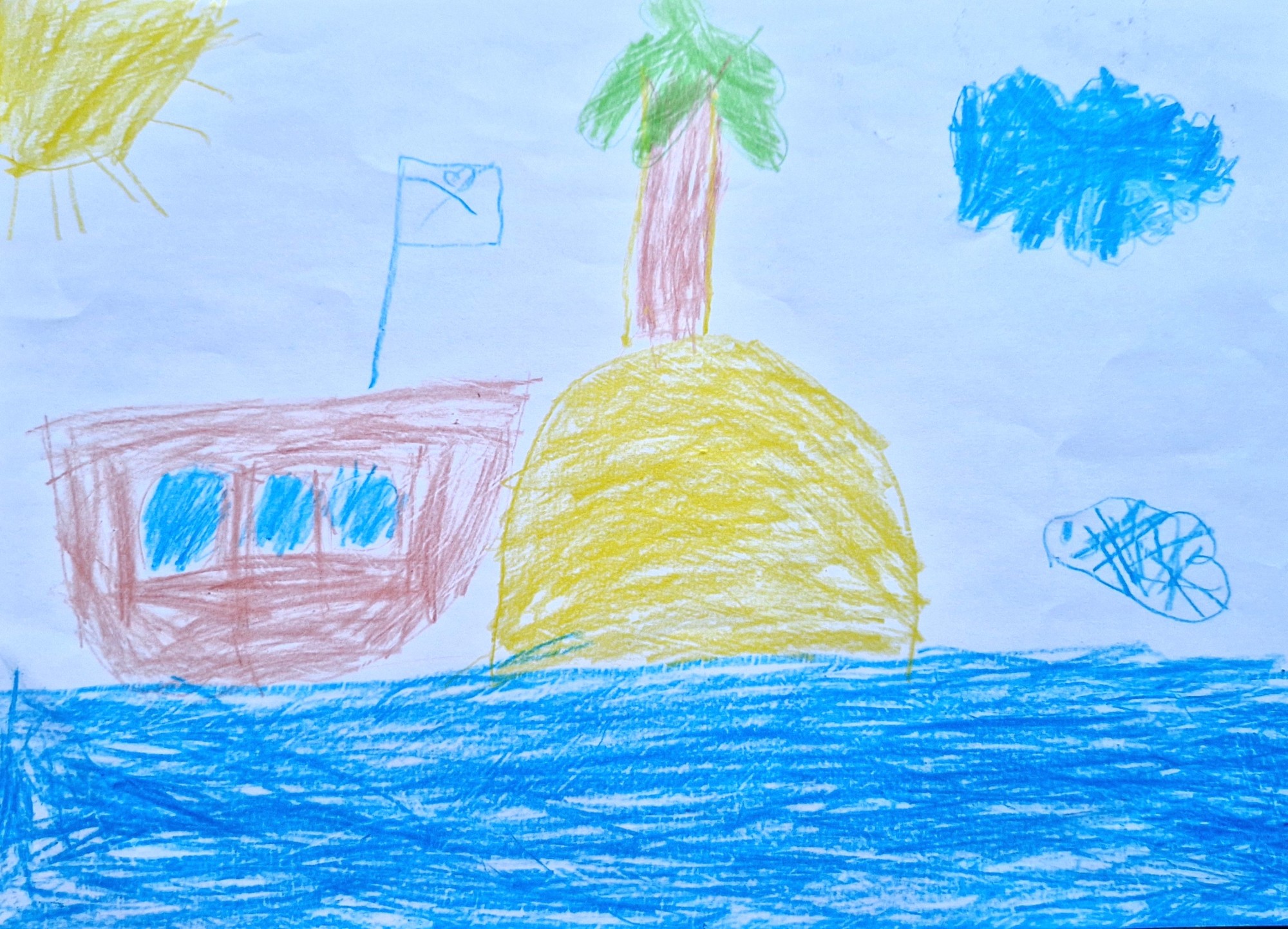 Jūrā peld kuģis un uz salas aug palma. Bez jūras kuģiem nebūtu kur peldēt.