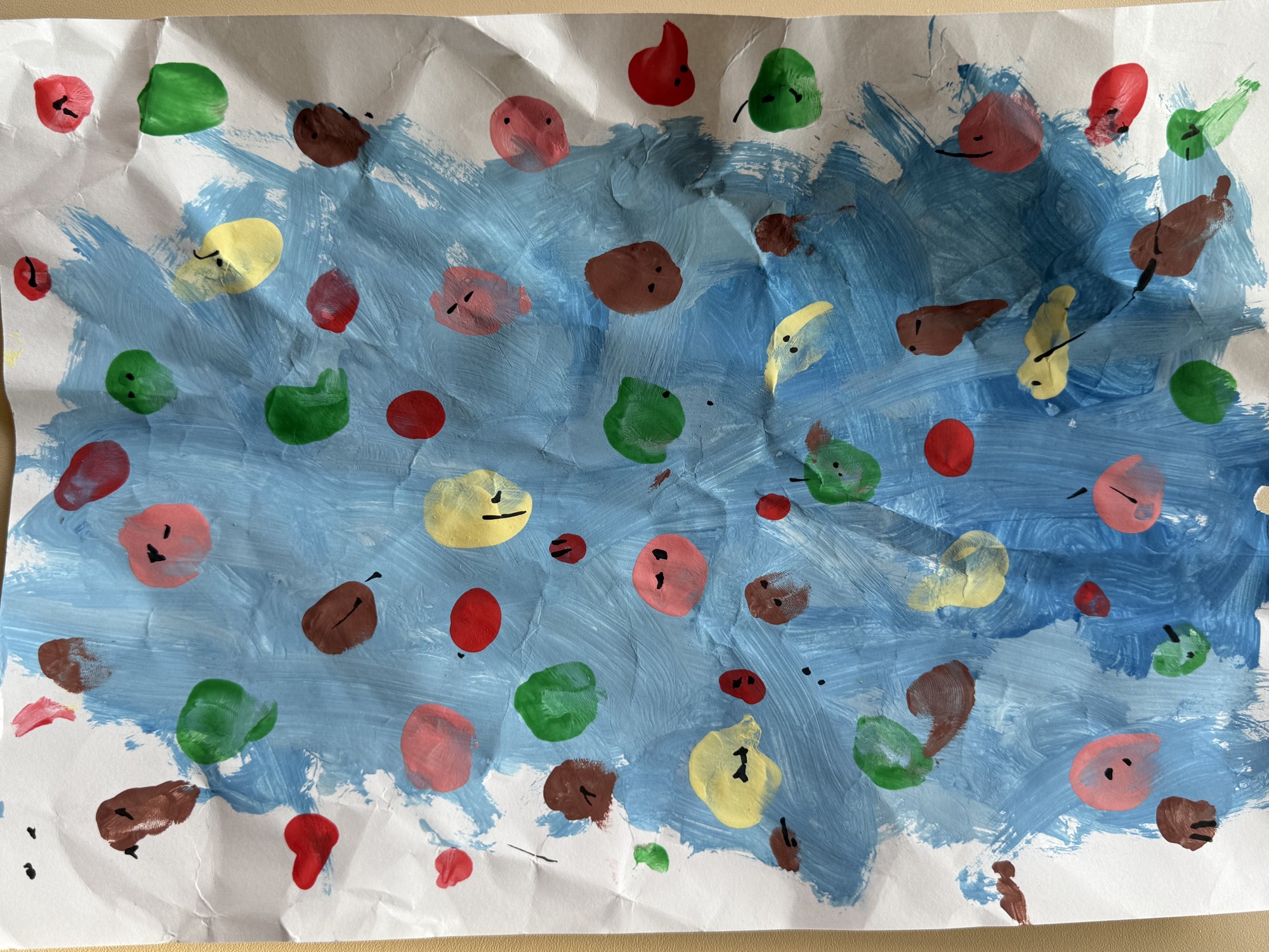 Darbā attēlots ūdens kā vieta, kur mājo dzīvas radības. Krāsainie nospiedumi simbolizē ūdens iemītniekus, bet zilās krāsas fons- tīru un dzīvībai nepieciešamo ūdeni.
