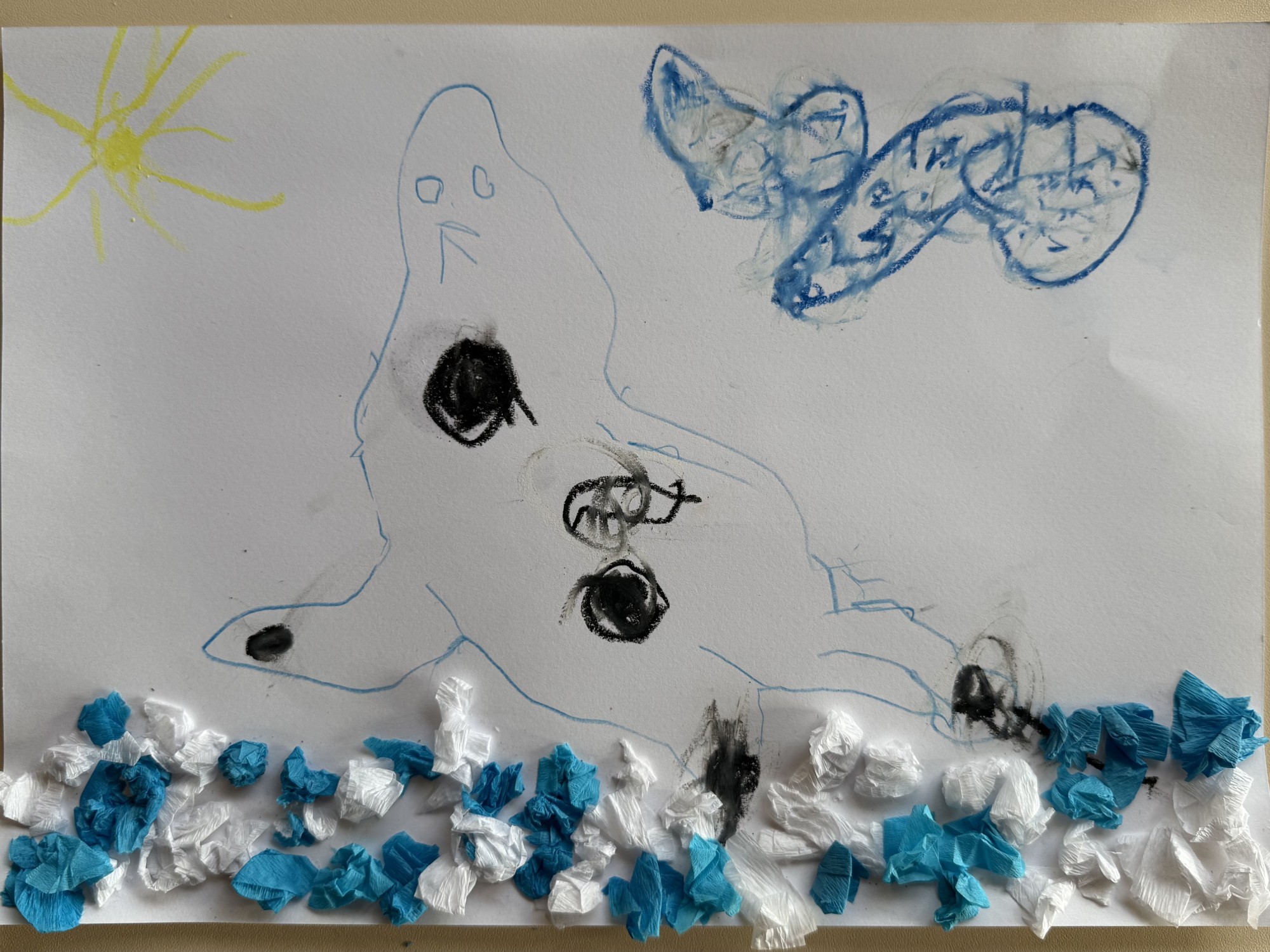 Meitene ar trafareta palīdzību darbā attēlojusi roni, kuru redzējusi Ventspils jūras krastā. Tas gozējās saulītē, atpūtās un uzkrāja enerģiju. Darbs parāda, cik skaista ir daba un tās iemītnieki, arī ronis, kurš dzīvo un peld jūrā. Bez ūdens tas nespētu dzīvot.