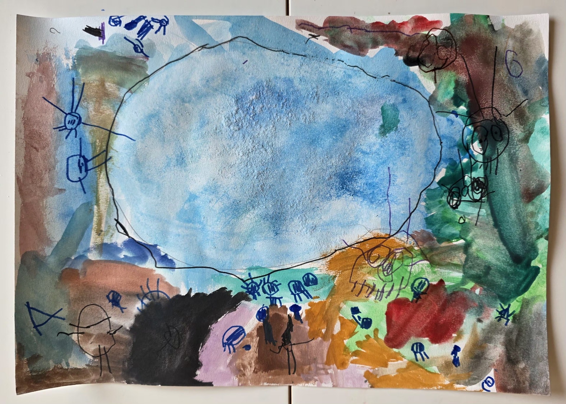 Bērni zīmēja ar ūdenskrāsām, vispirms zilu ūdeni, pēc tam apkārtējo pasauli. Kad lapa bija nožuvusi, citi bērni zīmēja dzīvo radību ar flomāsteriem.