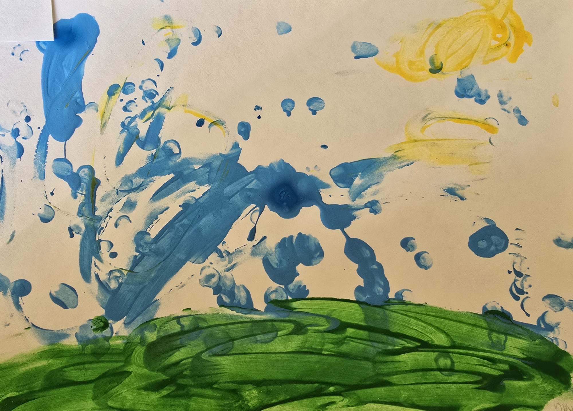 Darbā attēlots lietus, saule un zāle - dabas elementi, kas rada dzīvību. Lietus pilieni simbolizē ūdeni kā svarīgu resursu visai dzīvajai dabai. Saule un zaļā zāle parāda - kā ūdens palīdz augt un attīstīties.