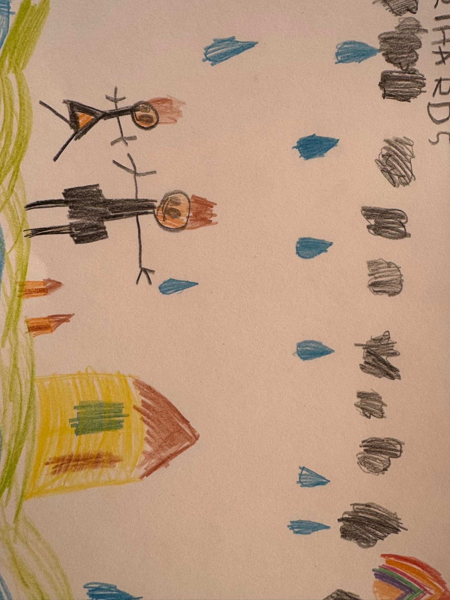 Zīmējumā attēlots lietains laiks pie ūdens – redzama upe vai ezers, mājiņa un cilvēki krastā. No mākoņiem krīt lietus, bet debesīs parādās arī varavīksne. Darbs parāda ūdens nozīmi dabā un laikapstākļu dažādību.