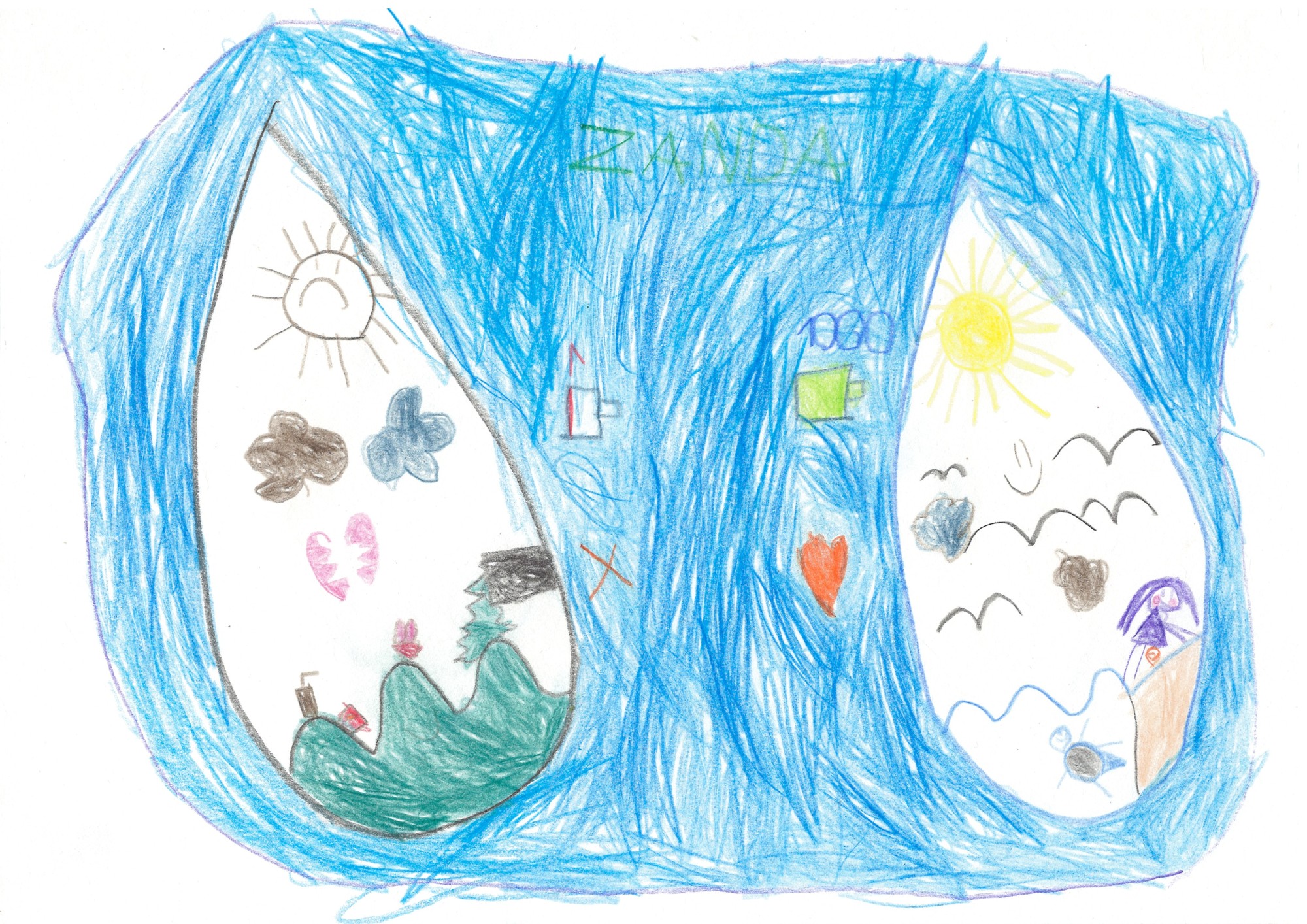 Šajā zīmējumā bērns atklāj ūdeni kā dzīvu un jūtīgu dabas daļu, kurai var būt divas sejas: priecīga un skumja. Savā darbā bērns attēlo kontrastu starp tīru, dzīvību dodošu ūdeni un piesārņotu, apdraudētu vidi.