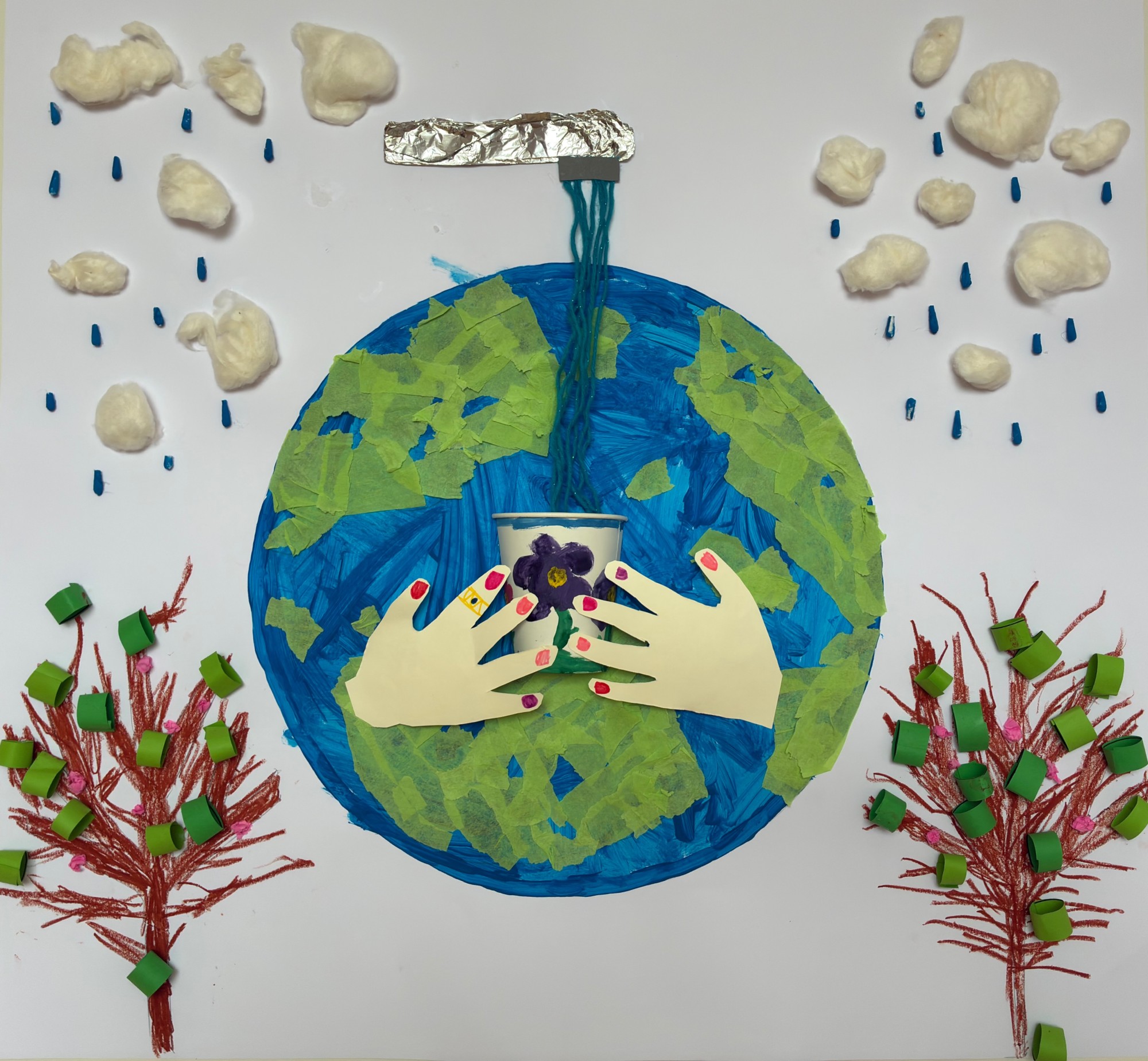Šajā darbā uzsvērta ūdens nozīme un tā taupīšana. Planēta attēlota cilvēku rokās, atgādinot, ka mēs esam atbildīgi par dabas resursu saglabāšanu. No krāna plūstošais ūdens dod dzīvību mums visiem, simbolizējot, ka katrs piliens ir vērtīgs. Lietus un koki apkārt parāda dabas līdzsvaru, kas iespējams tikai tad, ja ūdeni lietojam apdomīgi. Darbs aicina taupīt ūdeni ikdienā, jo no tā ir atkarīga dzīvība uz Zemes.