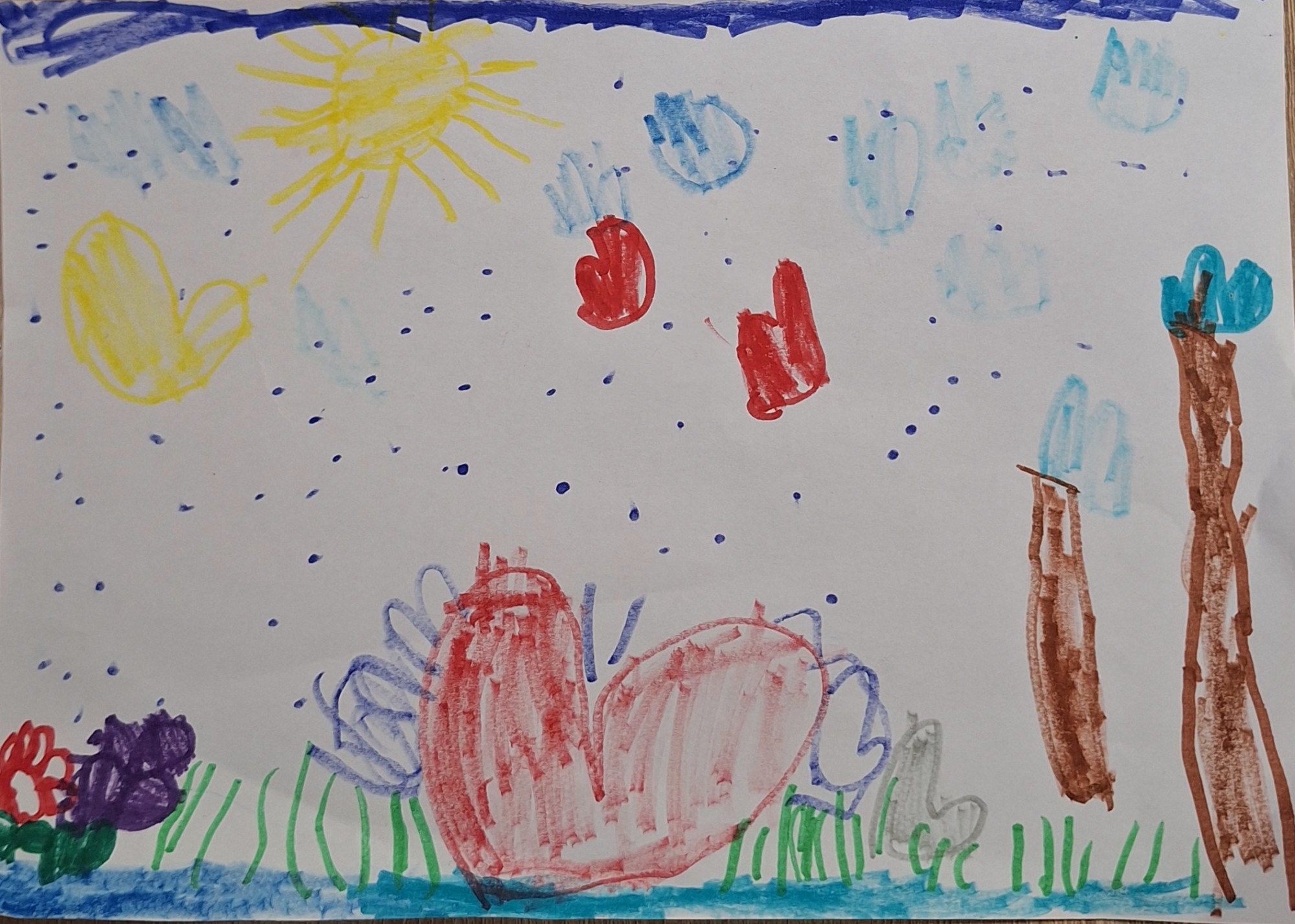 Zīmējums zīmēts ar flomasteriem.Zīmējumā attēlota dzīvā daba, kurā visiem nepieciešams ūdens.