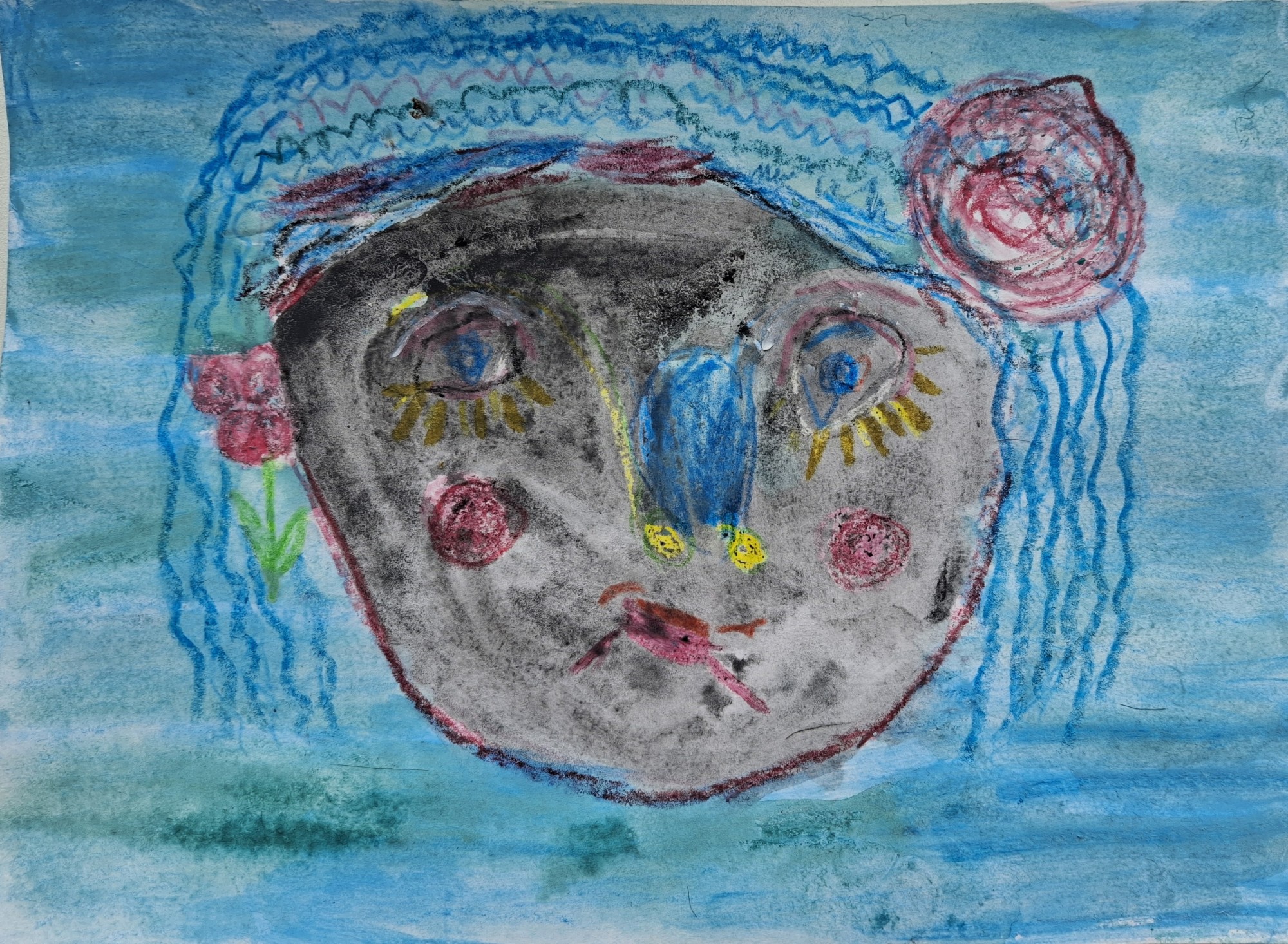 Zīmējuma autore saka: "Man patīk pasakas. Tur dzīvo arī ūdensmeitiņa."Bērna zīmējums tapis vairāku mēnešu tēmu apguves rezultātā, proti, Iepazīsimies! Es un mans ķermenis, Es jūtu un sajūtu, Mazie liepājnieki. Patiesībā ceļš bija garš, lai meitene varētu uzzīmēt savu ūdensmeitiņu, sākot no bērnu spēles "Punktiņš, punktiņš, komatiņš", kad top sejas galvenie elementi, spoguļošanās spēles, kad izzinājām sejā tik svarīgās acis, mācījāmies latviešu valodā nosaukt to daļas, varbūt tieši tāpēc ūdensmeitiņai ir tik izteiksmīgas skropstas. Līdz daudzu latviešu mākslinieku gleznu un zīmējumu rūpīgai izpētei. Bijām mazi pētnieki un uzzinājām, ka seja mākslas darbos var būt ne tikai baltā vai smilšu, bet pat ļoti bieži melnā krāsā. Likām uz galda Montessori krāsu tonīšu paraugus un meklējām atbilstošās krāsiņas, ja ūdensmeitiņa dzīvo ūdenī. Jautājums, kāpēc ūdensmeitiņai ir viļņaini mati, tāpēc ka tie ir ūdens vilnīši. Deguns gan ir vislielākais, jo patiesībā zem ūdens ir ļoti, ļoti grūti elpot. Šoreiz gājām to netradicionālo ceļu Latvijas pirmsskolā, kad iedvesmojāmies no Francijas bērniem un pasaku grāmatu vietā skatījāmies daudzu, daudzu LIELO mākslinieku darbus. Mēs arī vēlamies tik pat skaisti zīmēt un tas viss palīdzēja izdomāt mazo ūdensmeitiņu. Novēlam visiem bērniem un pedagogiem, lai mazo pētnieku gars nepazūd arī zīmējot! Veiksmi!