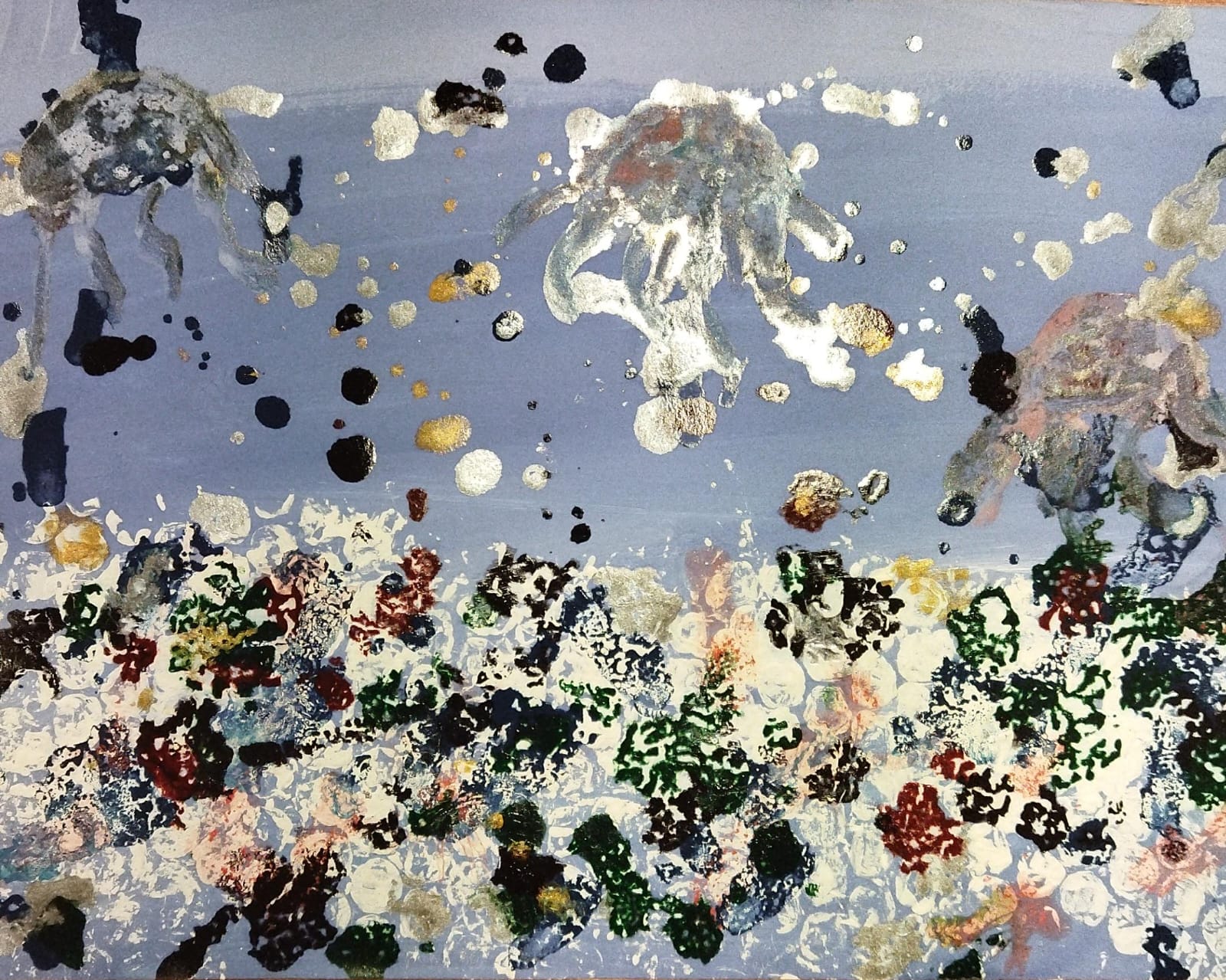 ZĪMĒJUMĀ IZMANTOTAS GUAŠAS MARMORĒŠANAS KRĀSAS, BURBUĻPLĒVES NOSPIEDUMI, KRĀSU PILIENU IZPŪŠANA.