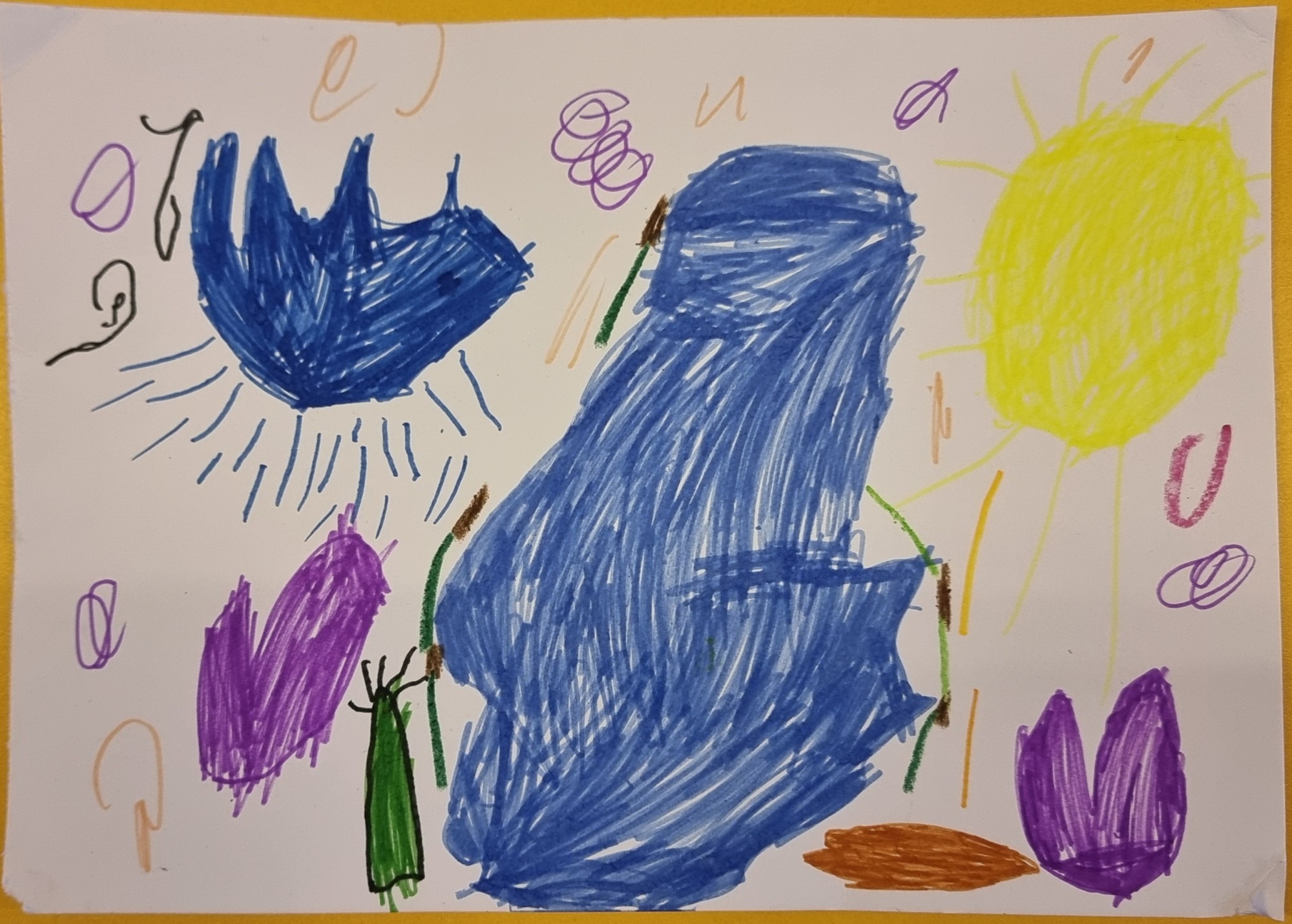 Es uzzīmēju dīķi, kas atrodas mūsu jaunajā zemes gabalā. Tur dzīvo zivis un kukaiņi. Es gribētu, lai pie mūsu dīķa augtu kaktusi, tāpēc es to uzzīmēju. Kad līst lietus un pūš vējš, tad dīķī var redzēt ūdens viļņus. Vēl es uzzīmēju divas sirsniņas, jo man tur ļoti patīk. Ar ūdeni un zemi var taisīt dubļus.