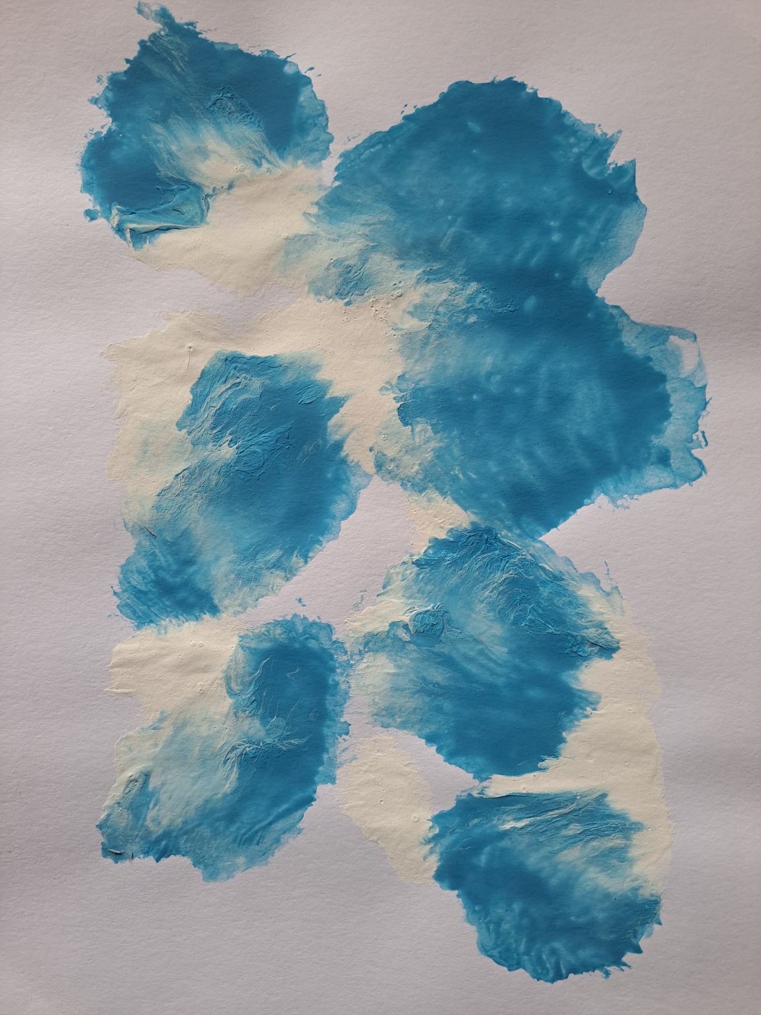 Zīmējums tapis kad uz lapas tika uzlikti baltas un zilas guaša krāsas punkti. Lapai pāri tika pārlikta pārtikas plēve un ar pirkstiņiem krāsa zem plēves tika zīmēta. Izveidojās interesanti mākoņi.