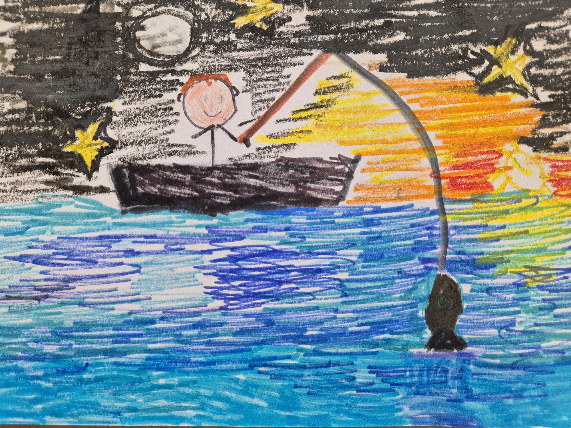 Zīmējumā attēlots Pēteris, kurš makšķerē jūrā.