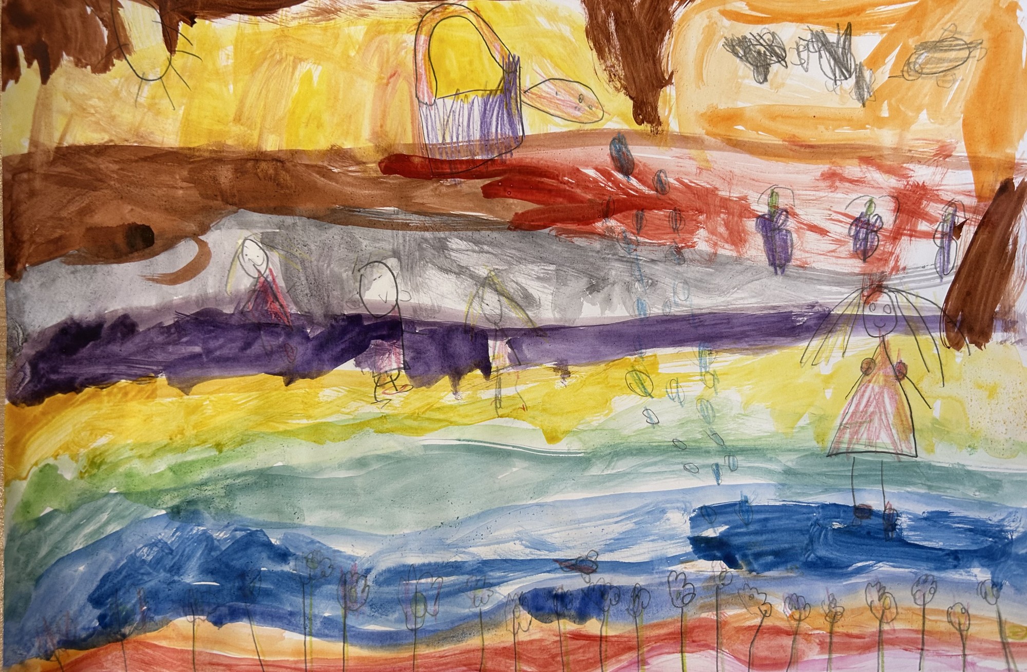 Darbs veidots, izmantojot krītiņus, flomāsterus un akvareļkrāsas.