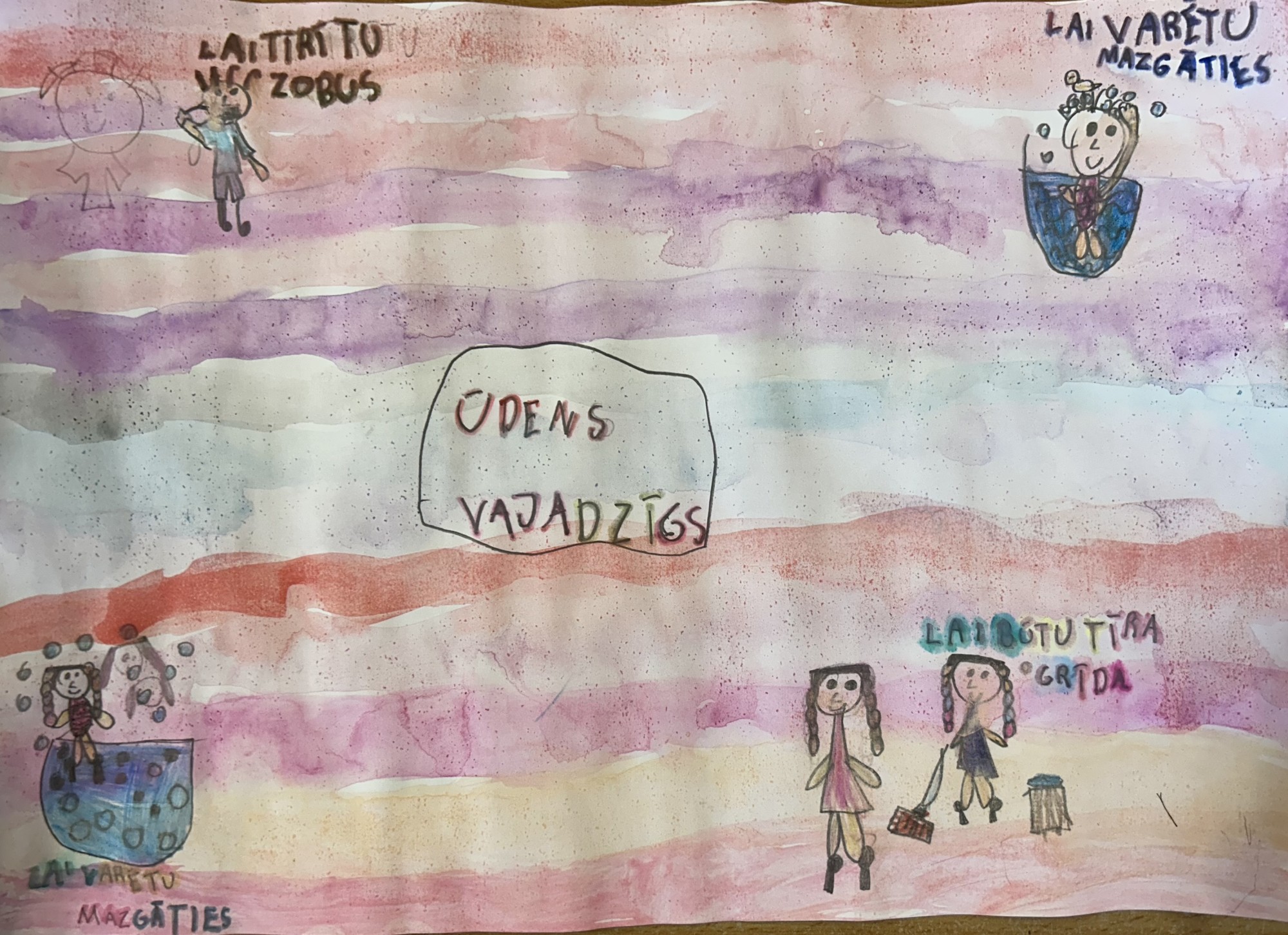 Darbs veidots, izmantojot krītiņus, flomāsterus un akvareļkrāsas.