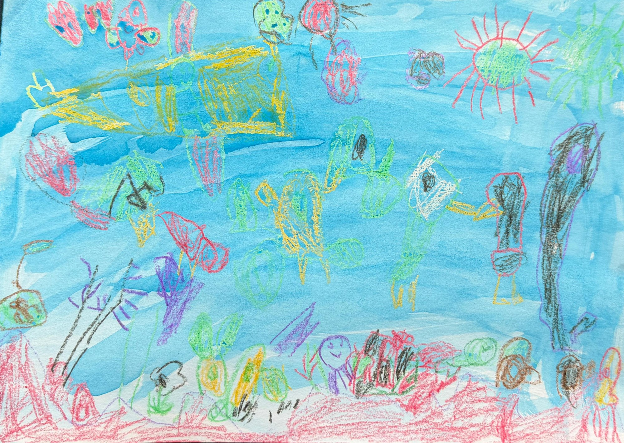 Darbiņā redzama krāsaina zemūdens pasaule, kurā sapulcējušās dažādas zivis un jūras radības. Tās it kā dejo un rotaļājas ūdenī starp augiem un burbulīšiem, radot jautru un dzīvīgu noskaņu. Zīmējums veidots jauktā tehnikā – ar krītiņiem un akvareli, kas piešķir ūdenim plūstošu un maigu fonu.