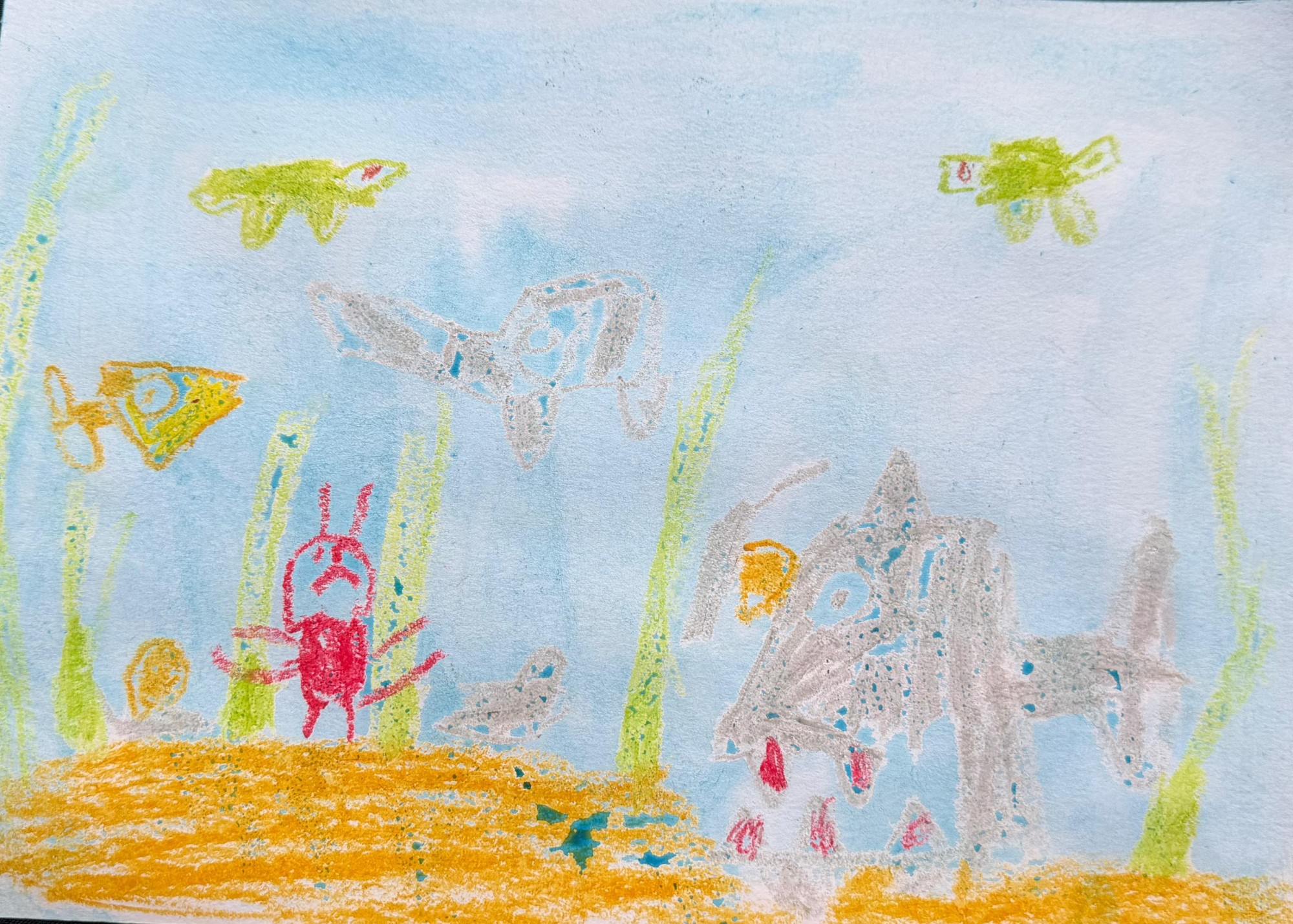Zīmējumā attēlota rosīga zemūdens pasaule, kur galvenais varonis ir sarkanais krabis – stingrs kārtībnieks. Viņš kļuvis pikts, jo pārējie ūdens iemītnieki pārsniedz zemūdens atļauto ātrumu.. Apkārt peld dažādas zivis un jūras radības, bet krabis uzmanīgi seko līdzi kārtībai. Darbs veidots jauktā tehnikā – ar krītiņiem un akvareli.