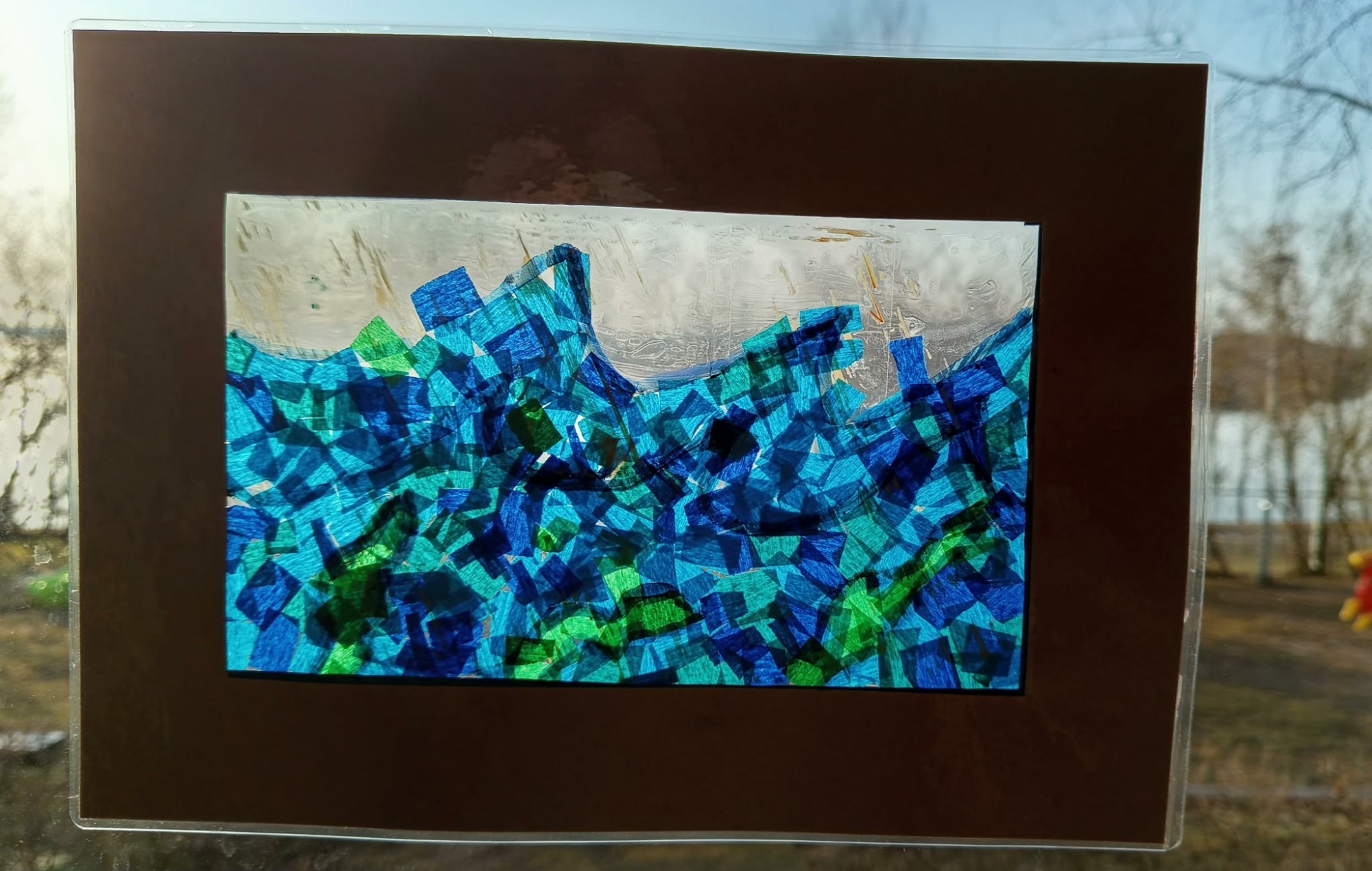Šis darbs ir veidots, izmantojot krāsainu krepapīru, kuru gabaliņi ir līmēti ar skoču, lai radītu jūras viļņu efektu. Dažādu toņu zilās un zaļās krāsas kopā ataino kustīgu, dzīvīgu ūdeni, kas atgādina jūru vējainā dienā. Darba augšējā daļā redzams gaišāks fons, kas simbolizē debesis vai gaismu virs ūdens.