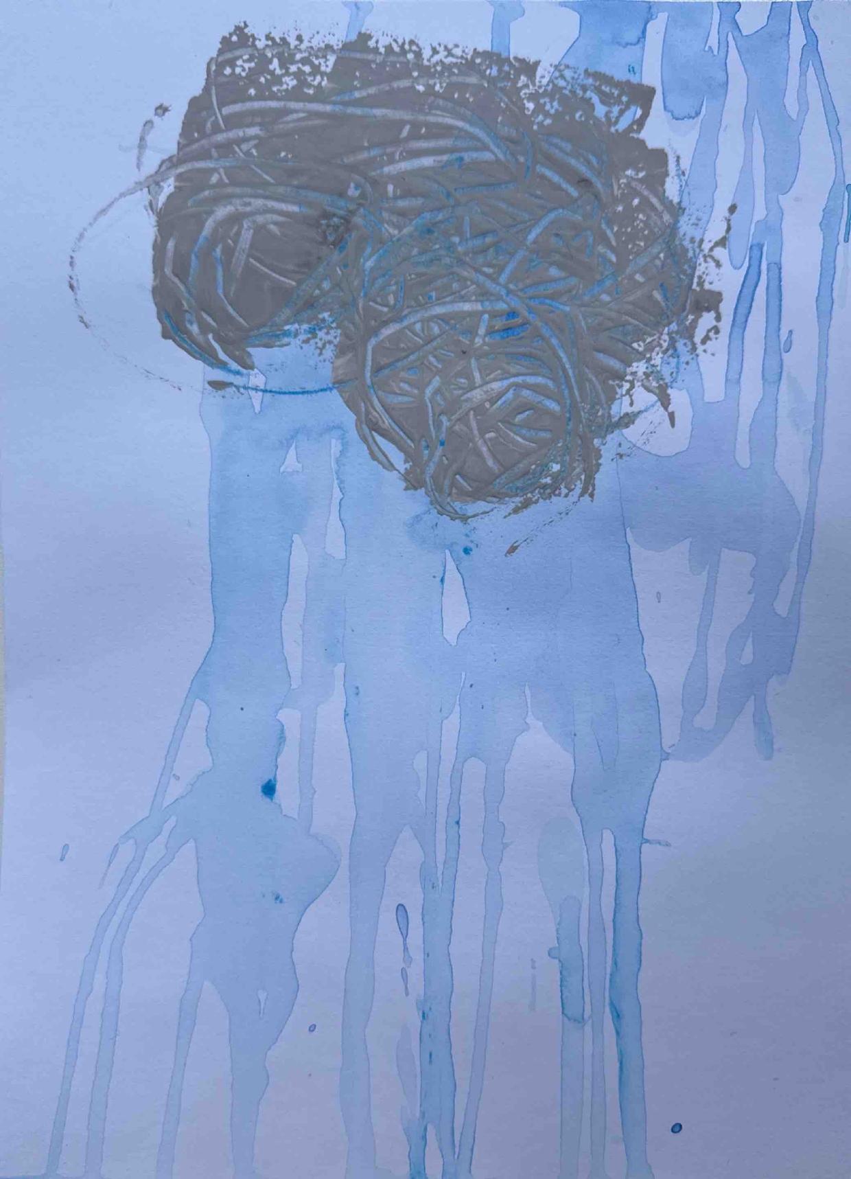 Lietus attēlots, ar pipeti pilinot iekrāsotu ūdeni uz papīra, ļaujot tam dabiski notecēt un radīt plūstošas, brīvas formas.