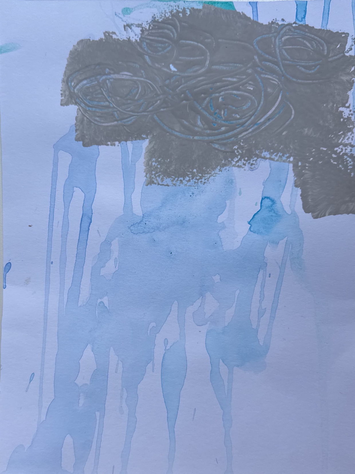 Lietus attēlots, ar pipeti pilinot iekrāsotu ūdeni uz papīra, ļaujot tam dabiski notecēt un radīt plūstošas, brīvas formas.