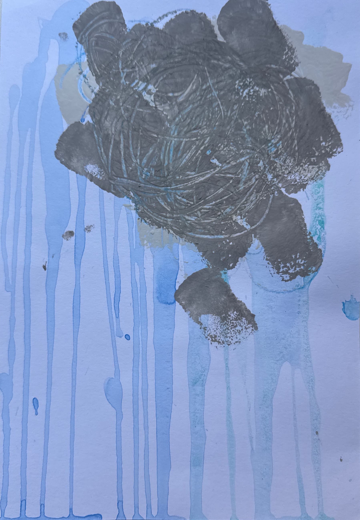 Mākonis veidots ar virtuves sūkli, piešķirot tam faktūru un apjomu, bet mākoņu gubu kustība akcentēta ar zīmuli, iezīmējot apļveida līnijas.