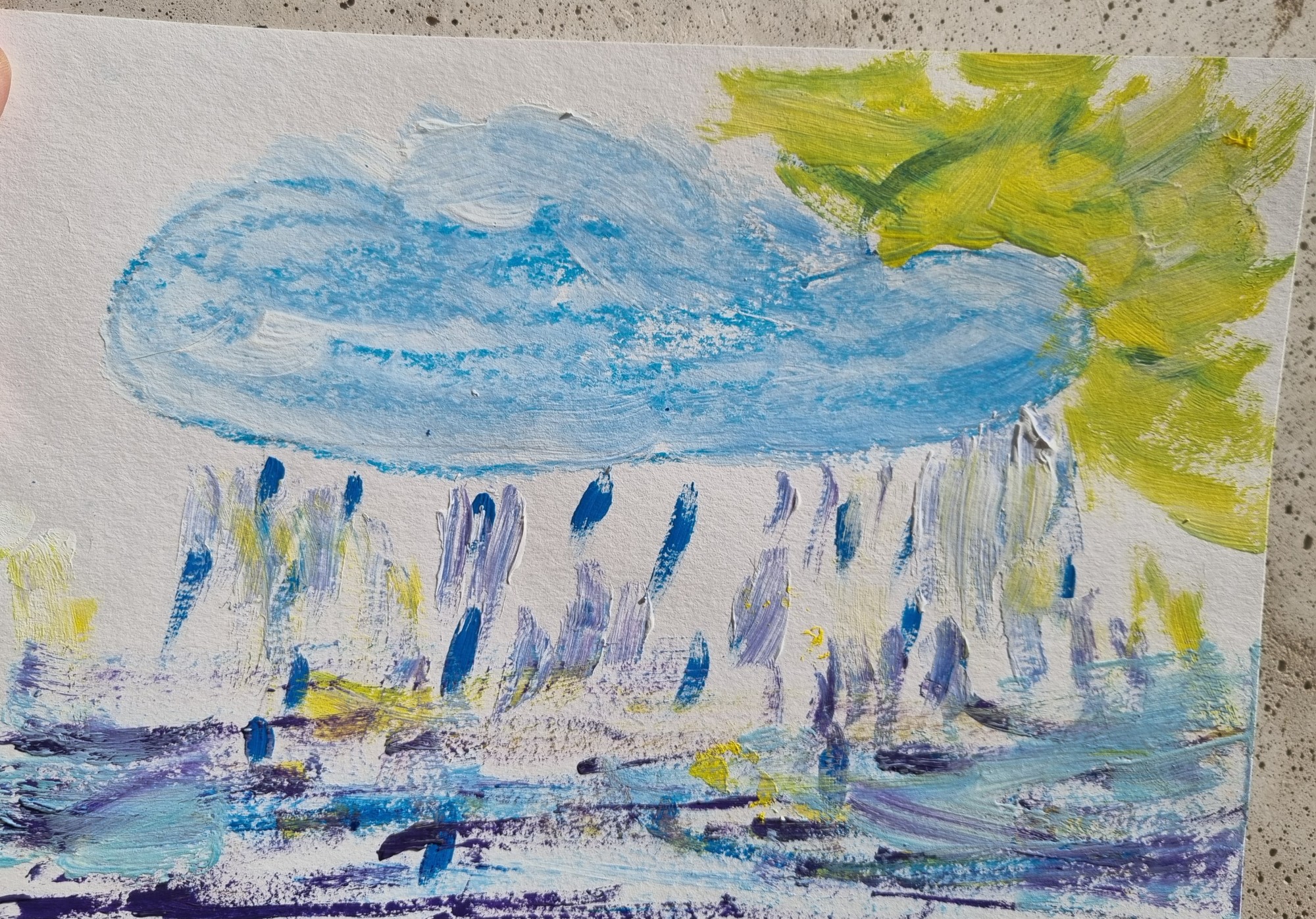 Visiem nepieciešams lietus un siltums, lai mums daba zaļotu. Zīmējam pagalmā. Katram bērnam rindas kārtībā ir vairāki otas triepieni. 11bērni, mākonis pārzīmēts ar krītiņu apvelkot trafaretu.