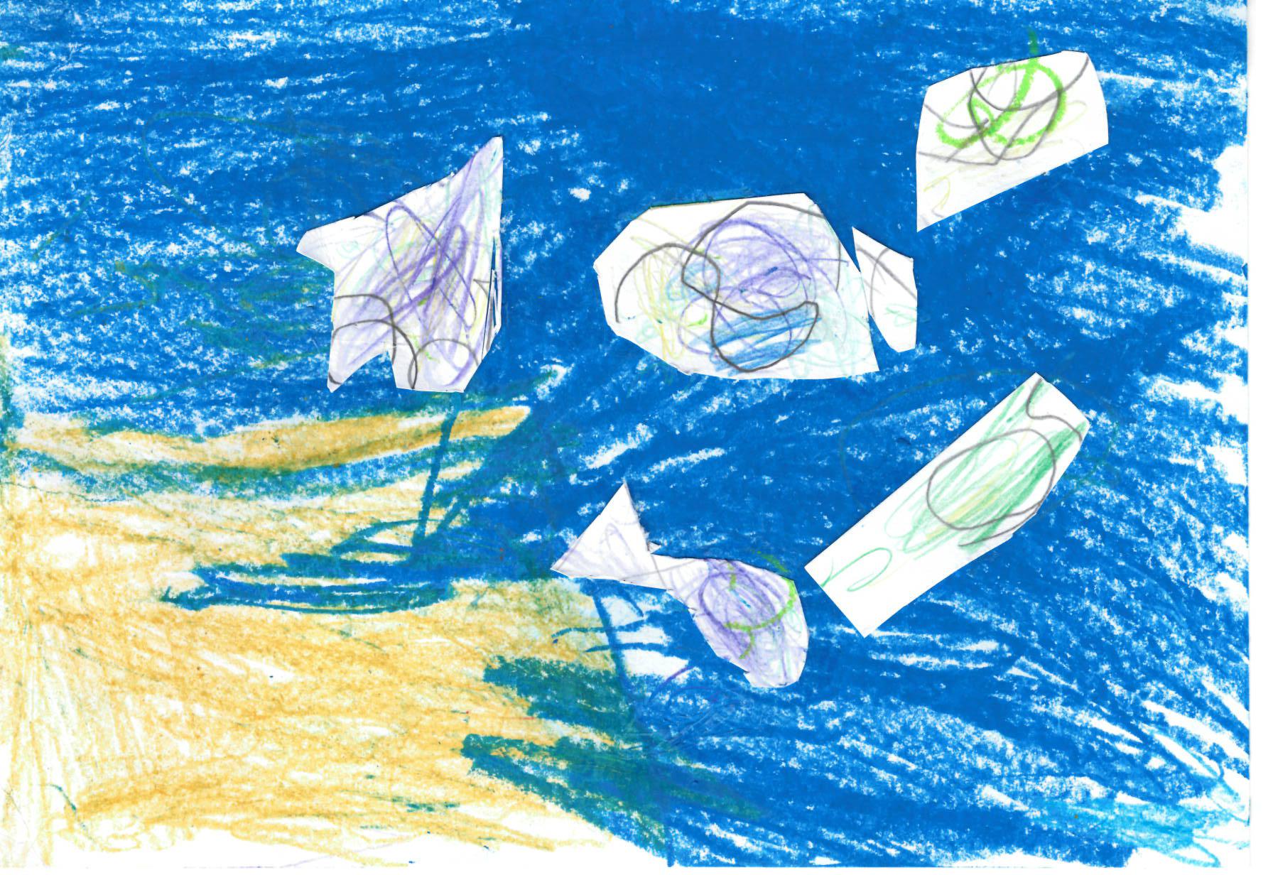 Zīmējumā attēlota saule un zivis ūdenī.