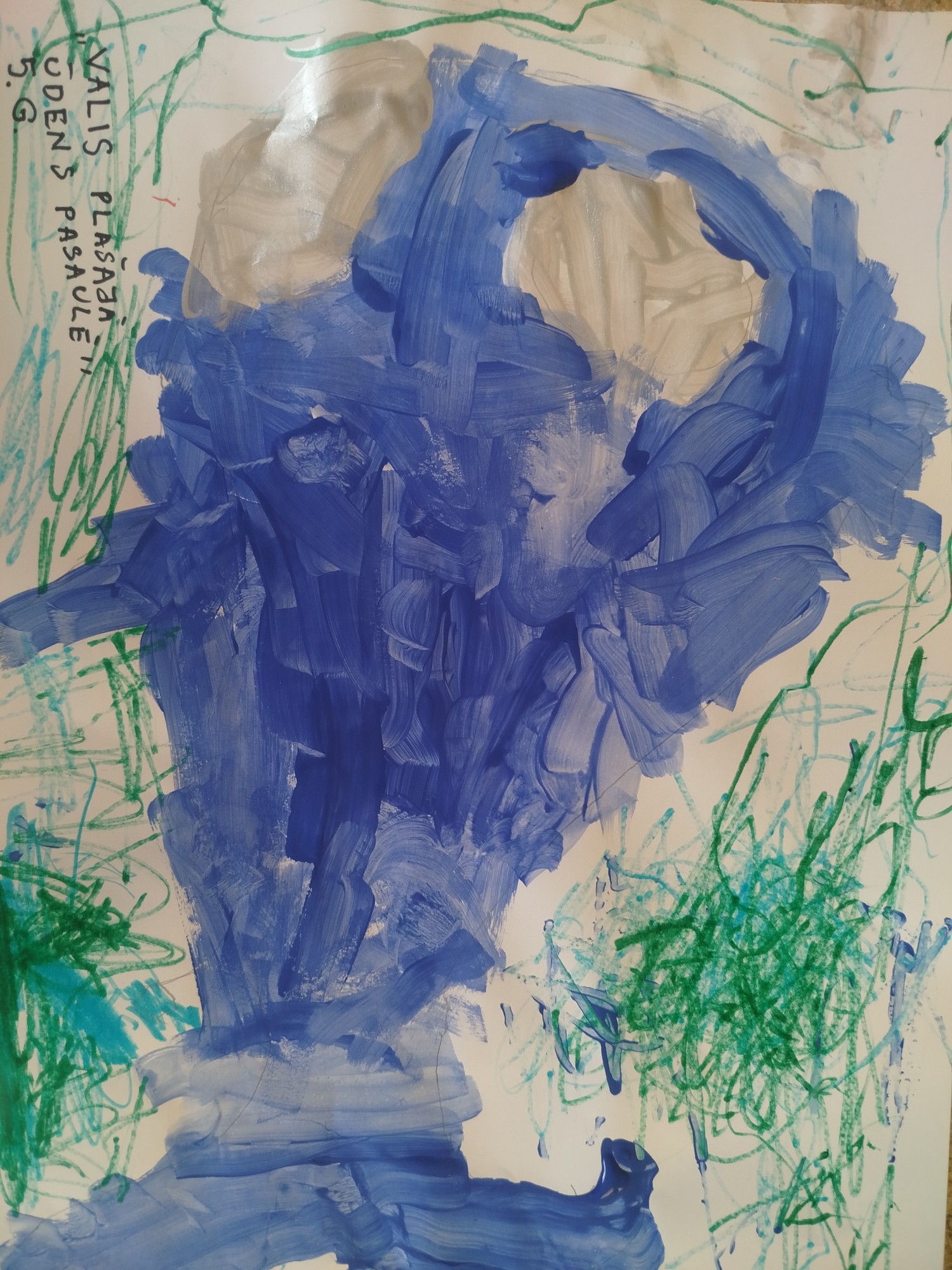 Autors, apvienojot guaša krāsas un flomasteriai savā darbā attēlojis vaļi, kurš ir viens no lielākajiem ūdens iemītniekiem. Tai pat laikā, ūdens pasaule ir vēl plašāka, tā ir visapkārt mums.