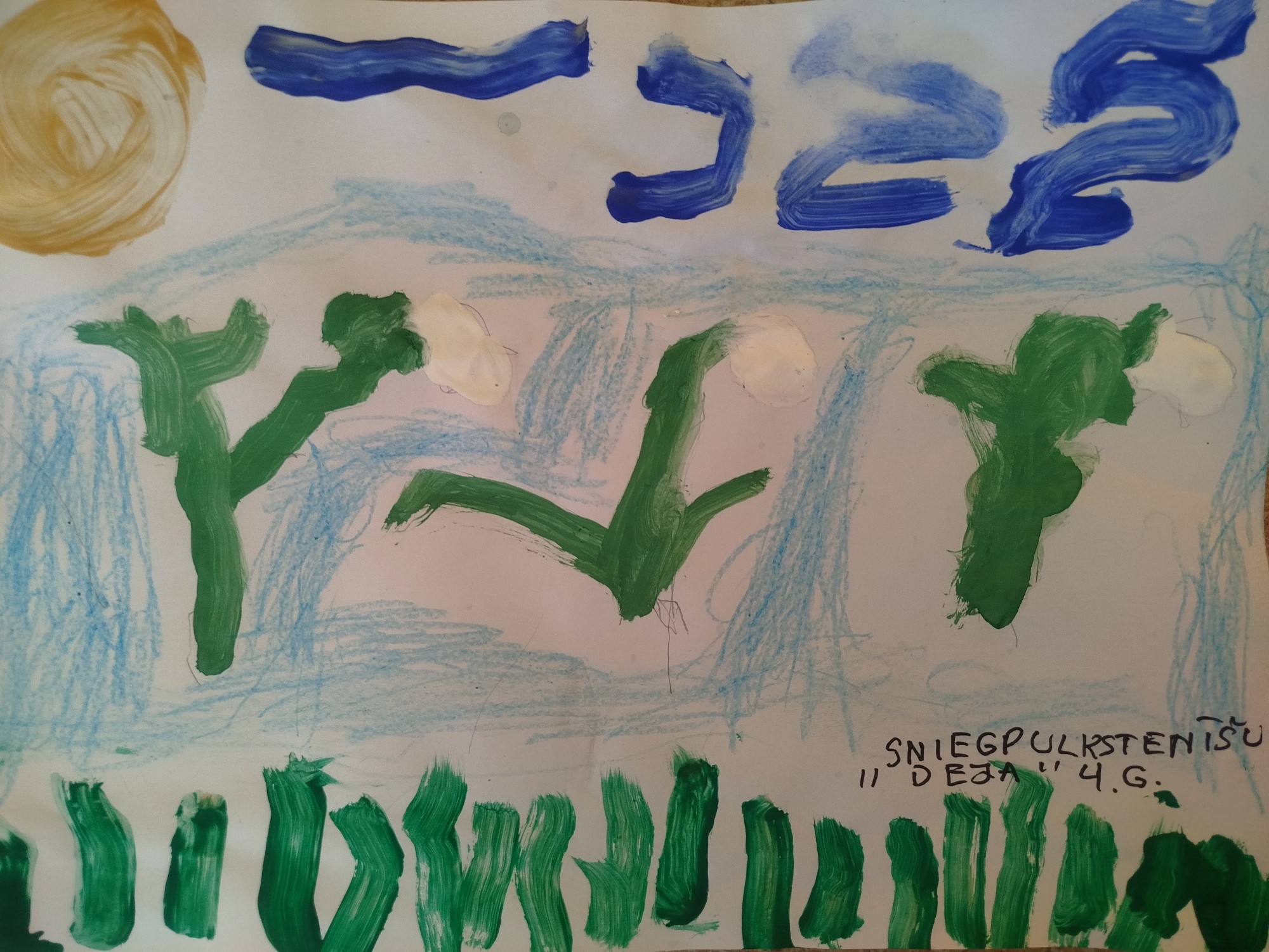 Apvienojot guaša krāsas un krītiņus, autors attēlojis pirmo pavasara vēstnešu - sniegpulkstenīšu deju pretī zeltainajiem saules stariem debesīs.