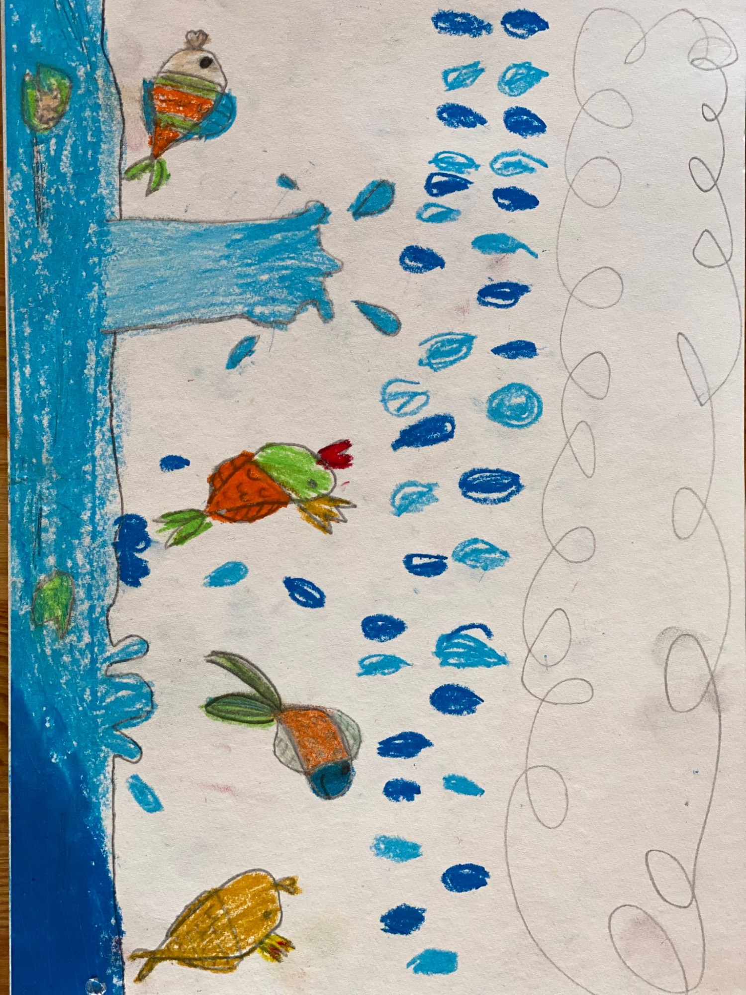 Zīmējumā attēlots ūdens kā svarīga mūsu pasaules daļa, kas dod dzīvību visām radībām.