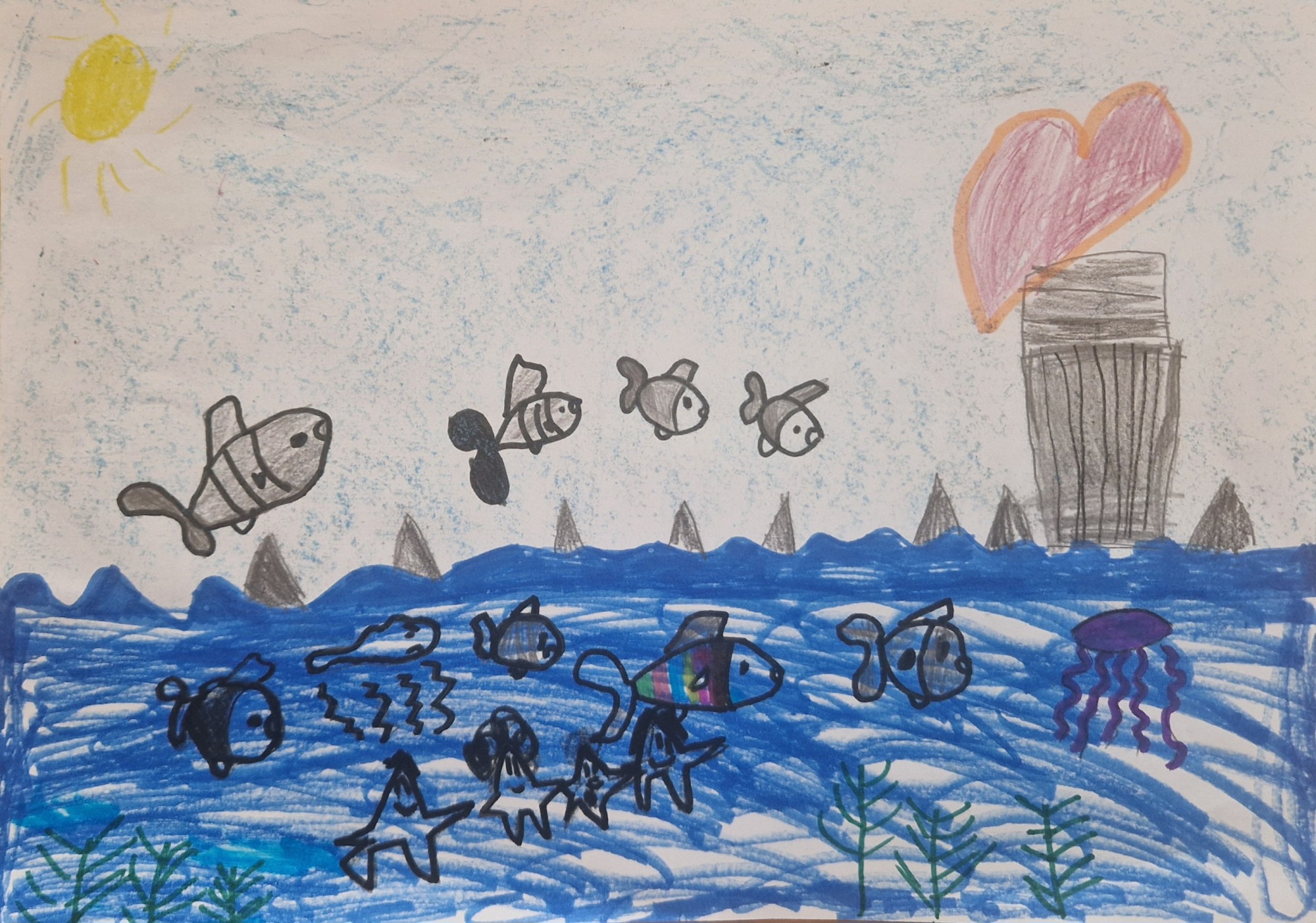 Zīmējumā redzamas daudz zivis, jūraszvaigznes, medūza. Tālumā peld haizivis, ir redzamas to spuras. Zivis izlec arī ārā no ūdens. Zīmējumā redzama arī laipa, kur cilvēki var nākt skatīties zivis. Sirds nozīmē, ka zivis ir jāmīl.