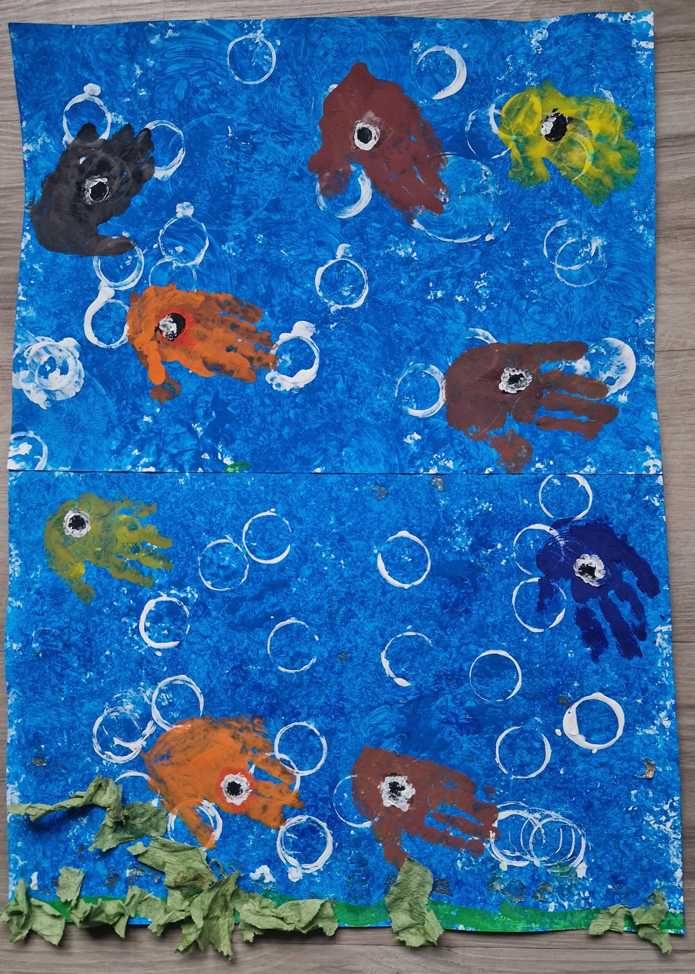 Zīmējumā attēlota krāsaina zemūdens pasaule. Uz zilā fona redzamas zivtiņas, kas veidotas no bērnu roku nospiedumiem dažādās krāsās.