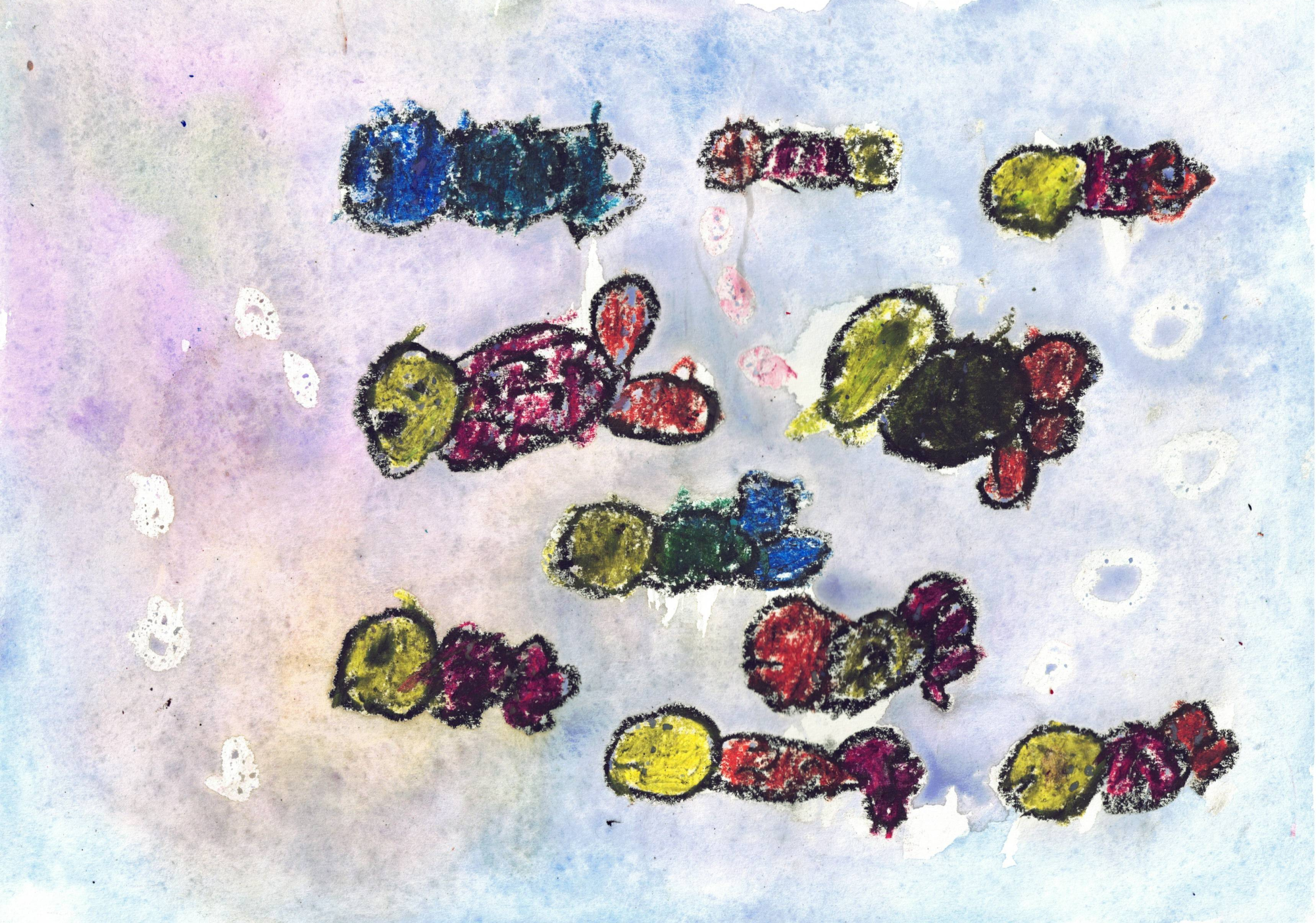 Krāsainās, sapņainās būtnes lēni peld cauri ūdens pasaulei, kur pilieni pārtop par debesīm un klusums kļūst par stāstu.
