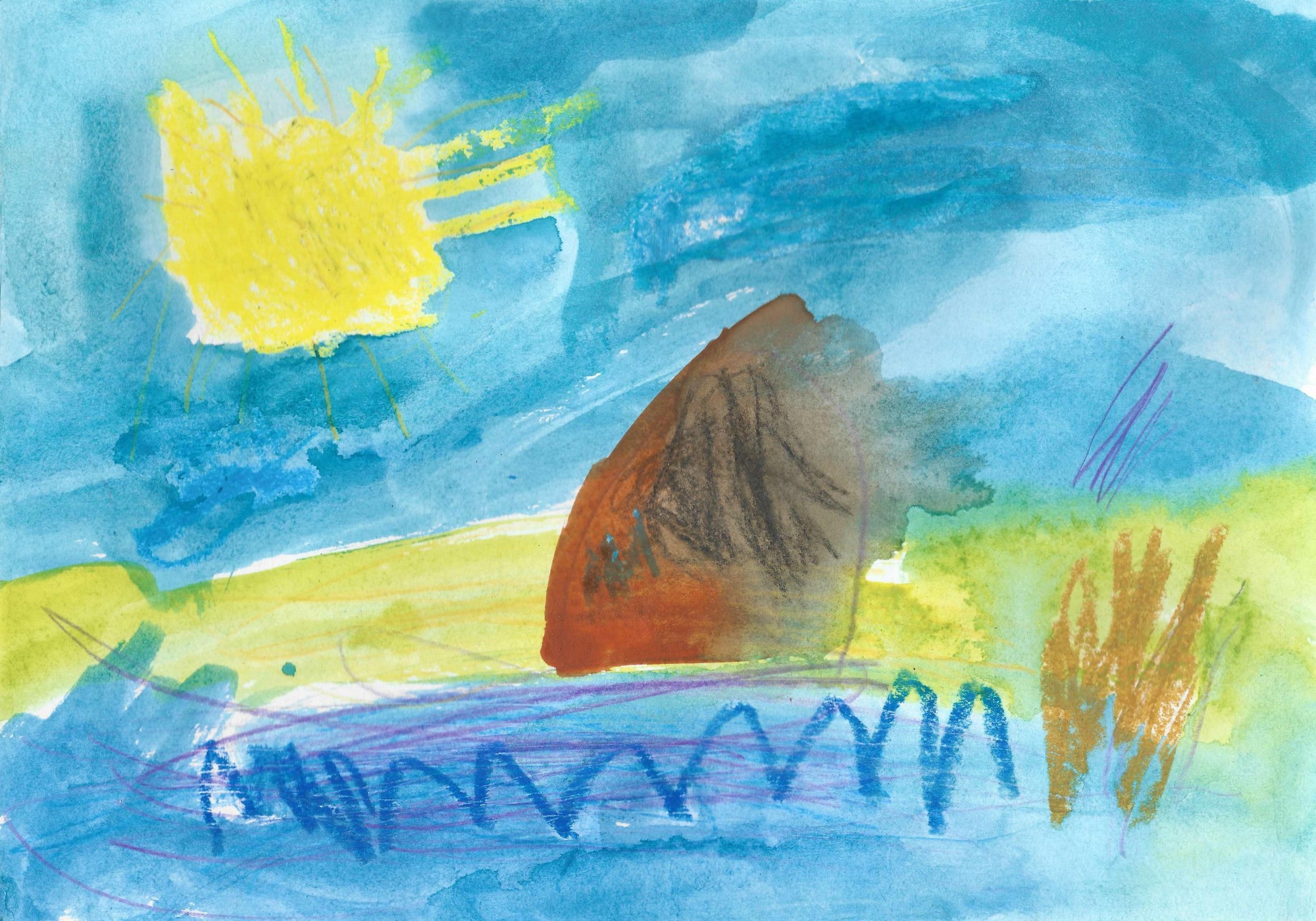 Es uzzīmēju laivu ūdenī, manu laivu, lai tiktu uz sapņu zemi. Tehnika: akvarelis, vaska krītiņi un zīmuļi. A4