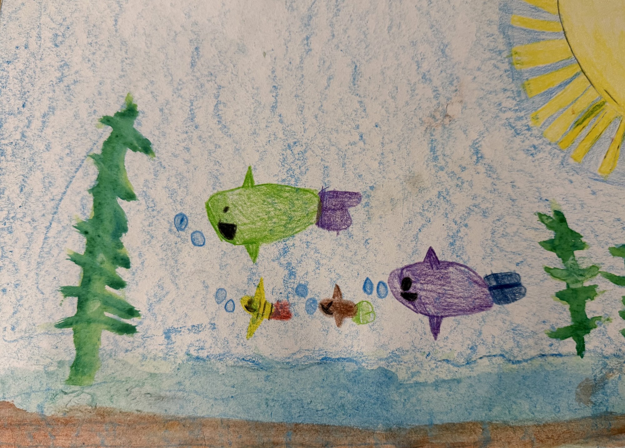 Šeit zivtiņu ģimene peld ciemos! Lielā, zaļā zivs ir pati priecīgākā, un viņai līdzi peld violetā draudzene un divi mazi bērniņi. Viņas visas laiž burbuļus un rotaļājas starp zaļajām jūras zālēm. Augšā spīd saule, kas silda visu ūdeni. Tā ir jautra un saulaina diena zem ūdens!