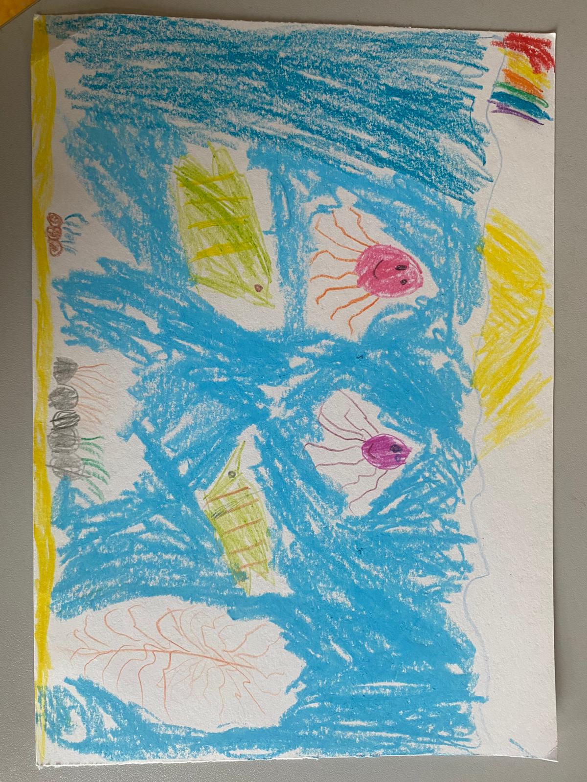 Zilie ūdens viļņi ir pilni ar dzīvību un košām zivtiņām. Virs tiem mirdz silta saule un krāsaina varavīksne.